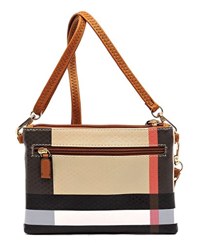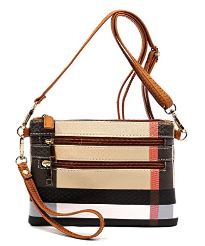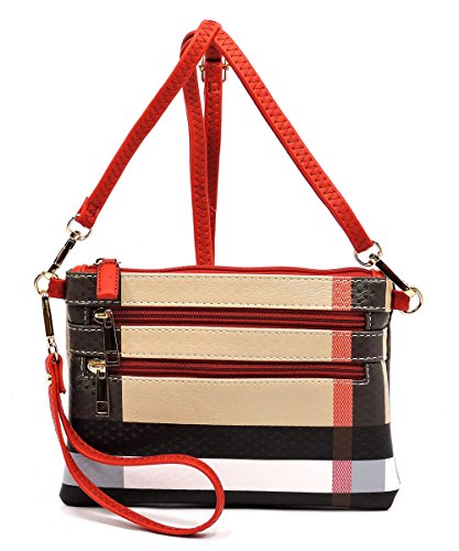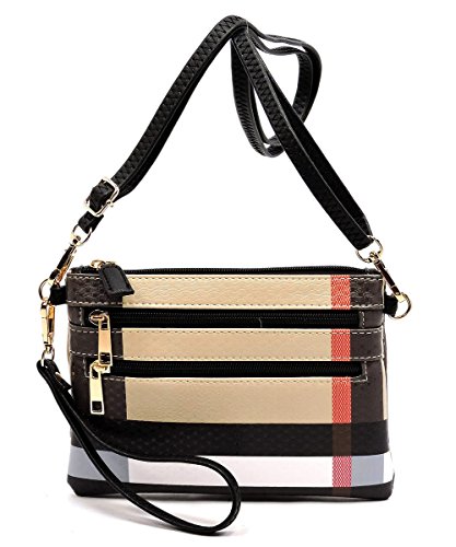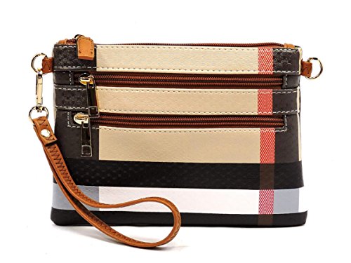 Product Description Elphis Tartan Plaid Check Crossbody Bag Clutch Made of High Quality Faux Vegan Leather Gold-tone hardware Zip top closure Removable Shoulder Strap Wrist Band Quality polyester fabric lining interior Interior lining with a back wall zip pocket Measure 8" length, 1" width, 6" height