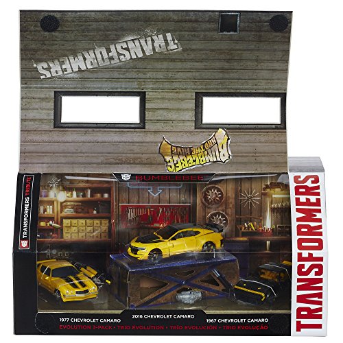 Imagine kickin’ it with the heroic Autobot scout from the epic Transformers movies with this Bumblebee Evolution 3-Pack. The premium, garage-style packaging showcases 3 slick Chevrolet Camaro models of Bumblebee from movies 1, 4, and 5.