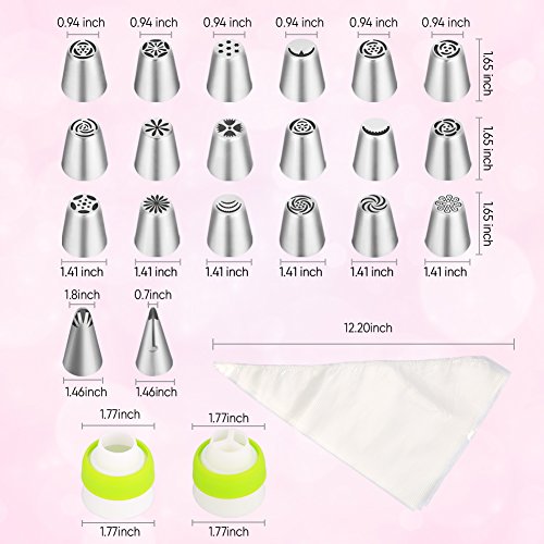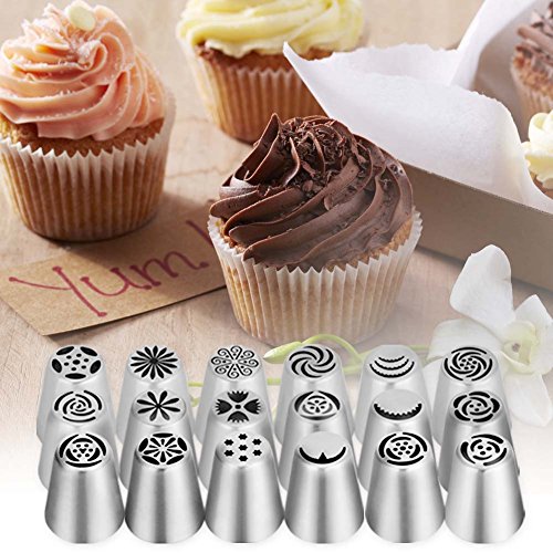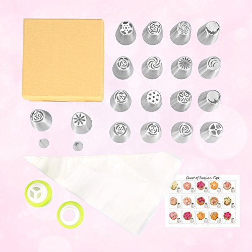 Product Description Ymiko:Focus On Quality and Service. Are you interested in baking but annoyed how to decorate cakes delicately? Ymiko Russian Tips can make you a professional cake-decorater ! 1. Larger Russian tips can help you decorate cakes easier 2. FDA approved stainless steel material 3. 18 flower piping Tips 2 leaf piping Tips 20 disposable piping bags 4. 1 single colour coupler 1 Tri-colour coupler 5. 2-year Warranty REFUND WITHOUT REASONS !