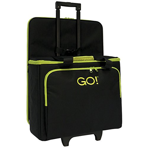 Accuquilt-go! fabric cutter tote & die bag: black. This two- wheel upright tote includes top carrying handles for easy lifting! secure the go! fabric cutter in place with interior hook and loop strap for a safe journey to your favorite quilting destination. Adjust the telescoping handle to a comfortable height and pull the easy-rolling tote. Tote and die bag made with reinforced padding and highest grade fabric. This package contains one 16x21x7 inch black tote with green highlights one 25x20-1/2 inch die bag for your 18x24 inch rotary Cutting mat (easily attach or remove with zipper siding) one 13x18 inch front pocket and two nineteen inch handles that Velcro together. Imported.Feature