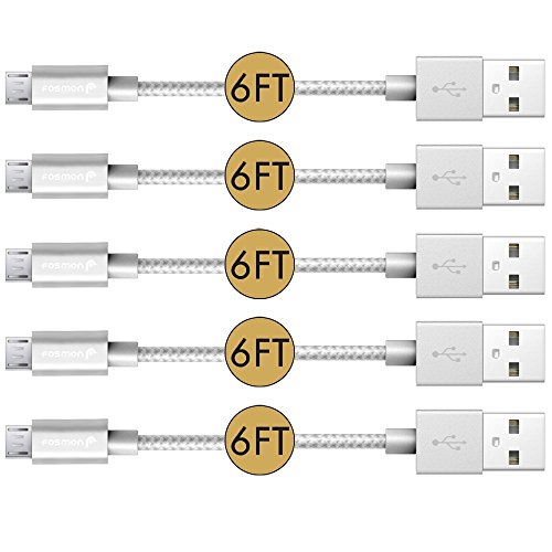 Fosmon (5 Pack - 6 FT) High-Speed Micro USB to USB Sync & Charge Data Cable - [Fabric Braided Jacket | Aluminum Housing | 480Mbps Speed] for Samsung, Motorola, HTC, Nokia, LG, Google Nexus, Sony Xperia, OnePlus, Smartphones & Tablets (Silver)
