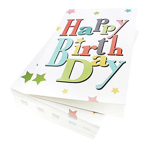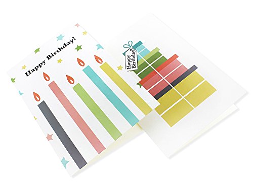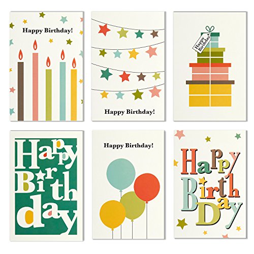 BIRTHDAY CARDS BOX SET: 48 pack of Happy Birthday greeting cards featuring 6 fun and colorful designs of gift boxes, candles, balloons, star buntings, and Happy Birthday fonts.