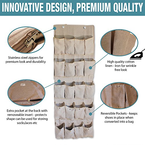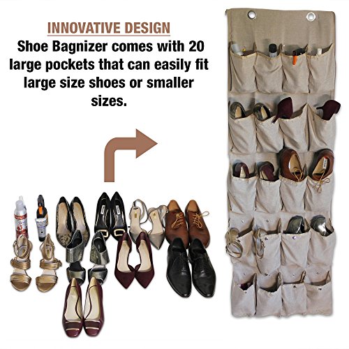 Shoe Bagnizer is specially designed with our customer's needs in mind. It offers three-fold solution for the price of one. Organize your shoes over a door, pack them up in a shoe bag or store them away under your bed!