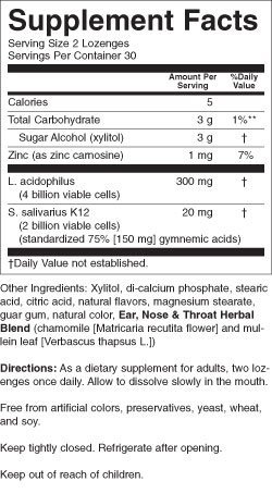 Studio : Nature's Plus Publisher : Nature's Plus Binding : Health and Beauty Product Description Adult#39;s Ear, Nose Throat Lozenges with K12 Probiotics -- Tropical Cherry Berry Flavor Nature#39;s Plus® Adult#39;s Ear, Nose Throat Lozenges promote healthy microbial ecology of the inner ear, nose and throat with the breakthrough probiotic K12! In addition to powerful immune-supporting benefits, Adult#39;s Ear, Nose Throat Lozenges provide the friendly flora that promote healthy, clean and fresh breath. Adult#39;s Ear, Nose Throat Lozenges also supply Lactobacillus acidophilus and zinc carnosine for a healthy GI tract and a strong mucosal membrane. Adult#39;s Ear, Nose Throat Lozenges feature a delicious natural tropical cherry berry flavor! Bottles of 60 Serving Size 2 Lozenges Supplement Facts ? Ingredient? Amount? % Daily Value 0