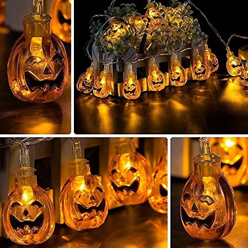 -. Feature : String lights of 20 pumpkins on a well made 7.2 Feet cord,12 Inches clear cable between wire and battery box. / Three Modes Switched To Be Chosen: Off/Steady/ Flash;Requires: 3 x AA Batteries (Not Included) / Since the lights do not require a plug, they can be used anywhere and for any purpose. Better than normal solar string lights. / Great decoration for Indoor,Covered Outdoor,Cosplay,Halloween Parties & Home Decorations / This is definitely a cute addition to your halloween decor. The wire is clear so it'll blend in wherever. It's very light so its easy to hang up.