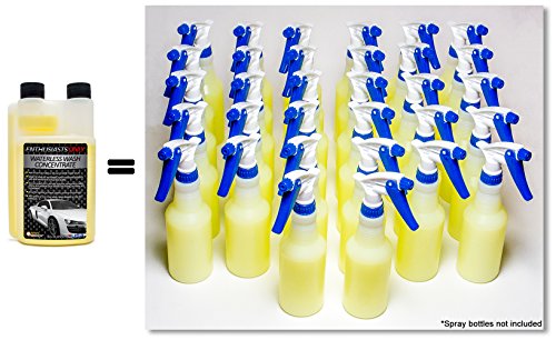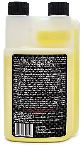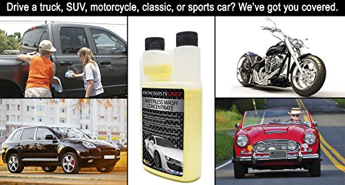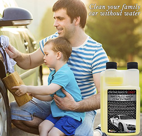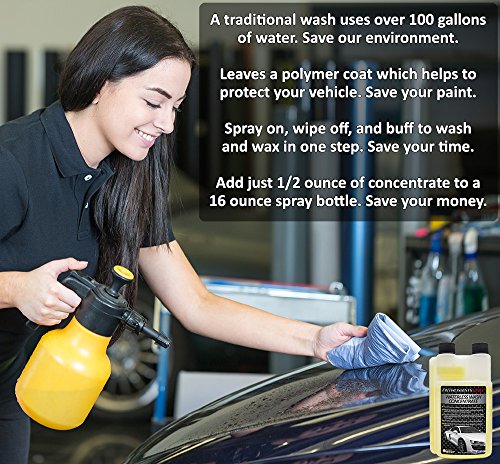 - Feature : One bottle of waterless car wash concentrate makes 32 ready to use bottles. Replaces your quick detailer, rinseless wash, and clay bar lubricant which allows you to shrink your car wash kit. Spend less time and money buying products and more time enjoying your vehicle. / Doesn't require a hose, bucket, or car wash soap or detergent so you can wash your car practically anywhere. Winter will soon be with us, but now you can wash your car, truck, or motorcycle, in the comfort of your garage, and you can do it risk free with our 90-day money back guarantee. / Live in an urban area or apartment with only street parking or a car port? Stop leaving your car unwashed or punishing it with automated car washes. Keep your vehicle looking great with just our waterless wash, microfiber cloths, and a spray bottle. / No need to rinse your car, so you will save an average of 100 gallons with this waterless wash. Save money on your water bill and help save our environment, especially if you're in an area impacted by drought. / Safely cleans your vehicle and leaves a glossy finish and protective polymer coat that helps shield your paint from the elements and harmful rays. Works on paint, plastic, chrome, glass, and even exterior vinyl wraps and graphics. No matter what type of vehicle you have you can keep it shiny and ready to hit the road.