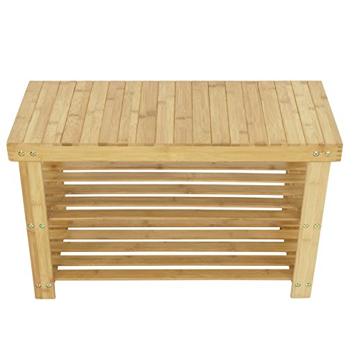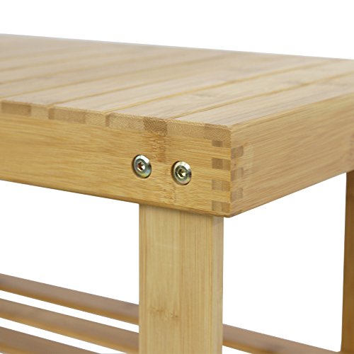 -. Feature : 100% natural bamboo, without formaldehyde; provides a more sophisticated look / 2 tiers bamboo rack & storage bench for shoes, bags, plants, toiletries, baskets in entryway, bedroom, bathroom, closet, etc / With its smooth surface, countersink screws and round corners, this rack will not cause harm to your belongings or your children / Designed with removable built-in fittings, it is more stable and durable than using self-tapping screws. All fittings have been treated for rust prevention / Product Size: 27.5" x 11.4" x 18" (LxWxH), Distance between the last layer and the floor: 1.6"