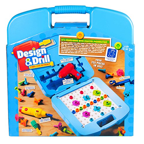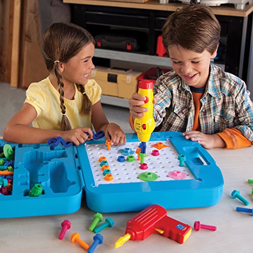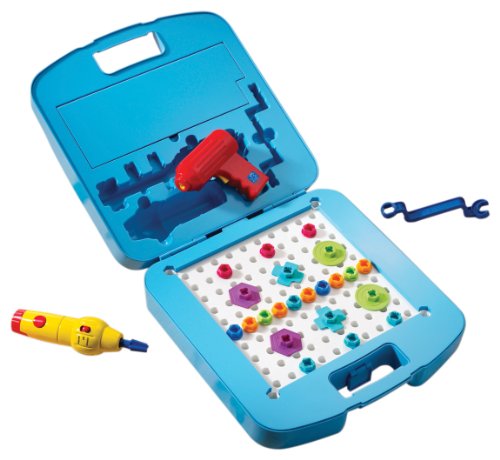 Design & Drill Power Tool Workshop—it’s overflowing with creative possibilities. This deluxe activity center offers oodles of creative play time for busy hands. Tools and bolts invite children to explore colors, shapes, and counting as they build fine motor skills. The power drill and jumbo power screwdriver are designed to be used with the interchangeable bits, while the hand wrench and screwdriver allow kids to play manually. Includes: 100 bolts in 5 colors, 20 Fun Bolts in 5 shapes and colors, 2 bits, power drill (requires 3 AA batteries, not included), power screwdriver (requires 3 AA batteries, not included), wrench and hand screwdriver, carrying case with built-in, removable activity board, and activity guide with 19 patterns for kids to follow.