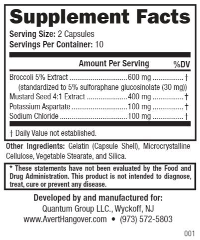 ✅Containing sulforaphane in clinically studied doses, Avert increases the body's ability to rid itself of acetaldehyde, the harmful byproduct of alcohol metabolism that causes the brunt of the hangover symptoms.