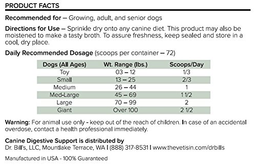 Dr. Bill's Canine Digestive Support contains a unique enzyme blend and powerful ingredients known for absorbing and removing harmful intestinal toxins. Combining decades of experience with the latest veterinary research and technology, Dr. Bill's Advanced Nutritional Support products are designed to meet the biological requirements for optimum nutrition in dogs and cats. Developed and manufactured in the United States, all products contain the vitamins, minerals, and other high-quality nutrients required for enhanced health, fitness, and longevity in our pets. For over 40 years, Dr. Bill Barnett has been working to keep pets living longer and healthier lives through optimum nutrition. After graduating from the Iowa State College of Veterinary Medicine, he began an ongoing course of study in preventive medicine for pets. Following a distinguished 23-year military career in human medical research and laboratory animal medicine, Dr. Bill went on to become the founder of AVN Global Sciences, Inc. where he developed canine and feline nutritional supplements for the veterinary profession and pet owners alike. He also founded a nutritional consulting service that provided expertise to veterinary companies including Norden Laboratories, SmithKline Beecham Animal Health, and Pfizer. Dr. Bill's Advanced Nutritional Support supplements are the culmination of this experience and knowledge. These supplements have stood the test of time and become valuable tools for veterinarians across the country. Accelerated degradation studies show our products have a minimum shelf life of three years after the manufacture date, retaining 97% of their nutritional value. All products should be kept covered and stored in a cool, dry place. Updated with the latest in scientific and ingredient technology, they are now available to discerning pet owners to keep their dogs and cats living long, happy, and healthy lives.Feature