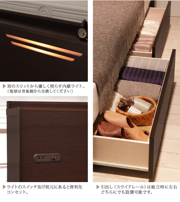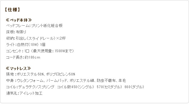 材質:[ベッド]本体-プリント紙化粧合板、コンセント-1口(1500W)、照明-10W(1個)、[マットレス]側地-ポリエステル50%・ポリプロピレン50%、中身-ウレタンフォーム・パームパッド・ポリエステル綿・防虫不織布・羊毛、コイル-デュラテクノスプリング・コイル数660、通気孔-アイレット加工