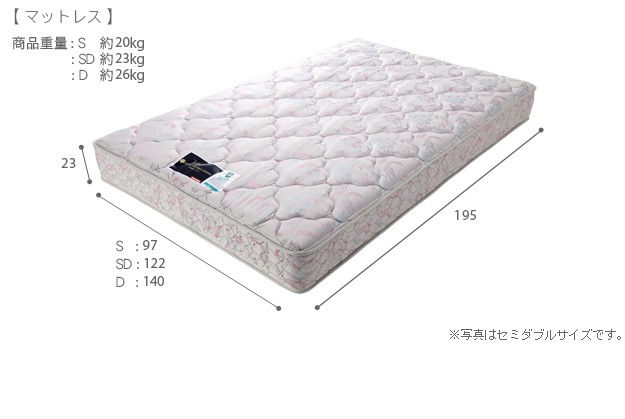 サイズ(cm):[ベッド]幅140x奥行207x高さ81(床板高さ22.5)cm・約65kg、[マットレス]幅140x奥行195x高さ23cm・約26kg