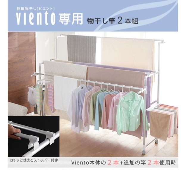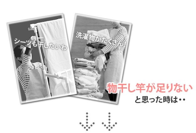 商品について:追加用のアルミ伸縮物干し竿(2本組)です。アルミ伸縮物干しスタンドに竿を追加していただくと布団等の立体干しをしていただけるようになります。干した時に空間ができるので通気性が良くなります。