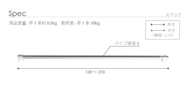 サイズ(cm):長さ120~210cm・直径3cm・重量約0.5kg/本、耐荷重約10kg/本