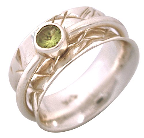 -. Feature : "HEART CHAKRA" 925 sterling silver spinning ring featuring a 5mm faceted peridot bezel set on the rounded edge spinner . / Peridot is one of the two colors that pertain to the heart chakra. Green, the color of nature speaks to selfless love Live fully in this world and maintain good balance with divine nature; recognize the spiritual world. / This ring measures 9.5mm from knuckle to knuckle and weights 6 grams. It is also treated with anti-tarnish finish for a lasting look. / The spinner's rounded edge allows it to spin smoothly on the textured base ring with a high polish finish that brings out the beauty of silver / Designed by Energy Stone, hand crafted in India.