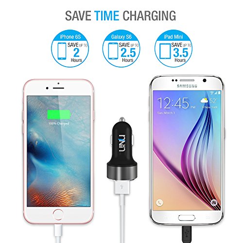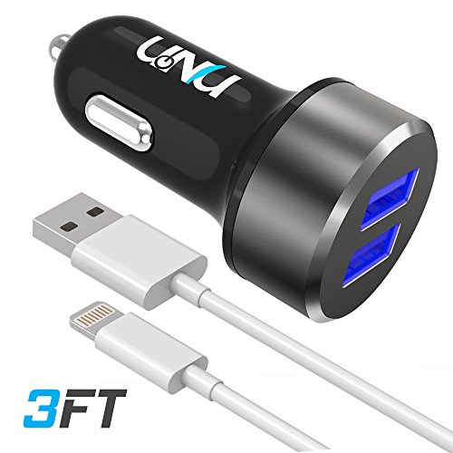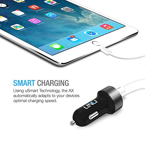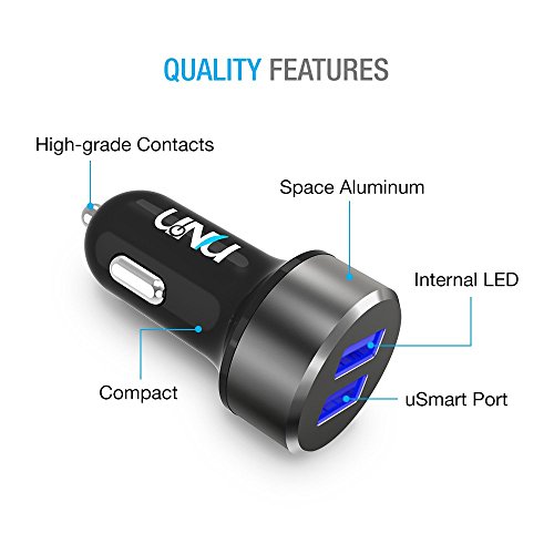 -. Feature : DUAL USMART & POWERFUL - Dual uSmart USB ports featuring UNU's proprietary technology that can quickly and easily identify yours mobile devices, to provide optimized maximal charging (up to 2.4A per port) for 2 devices simultaneously. iPhone 6S and others(max speed), iPad (max speed), and iPod, HTC, Galaxy, Blackberry, MP3 Players, Kindle Fire, Digital Cameras, PDAs, Mobile Phones. / 3FT CABLE - Includes a 3ft Apple Lightning Cable for conveniently charging iPhones and iPads. / PRACTICAL INNER-GLOWING - Featuring cool blue LED inner glowing from dual USB ports. The glowing ports are bright enough to easily locate at night. It is also specially dimmed to avoid distracting you when driving in dark. / NOT JUST PLASTIC - AX series constitute by the Spaceship grade aluminum head, German Bayer PC body and the Super Conductive Contact Pins. It can easily handle any extreme situation in your car / ULTRA PORTABLE - Compact design for added portability, easily fits in socket with limited space; featuring an input of: 12-18V; Output: DC 5V 4.8A or 24W with uSmart Technology (Shared by two ports)