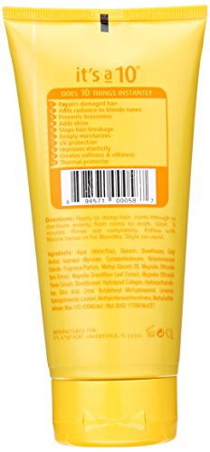 -. Binding : Misc. -. Brand : Its a 10 -. Feature : Adds shine and restores moisture / Tones hair color and reduces fading and extends vibrancy / Detangles and defrizzes / UV protectant / Designed for all blondes -. Label : Its a 10 -. Manufacturer : Its a 10 -. MPN : 379094 -. PartNumber : 379094 -. ProductGroup : Beauty -. ProductTypeName : BEAUTY -. Publisher : Its a 10 -. Studio : Its a 10 -. Title : It's A 10 Miracle Five Minute Hair Repair Conditioner for Blondes, 5 Ounce