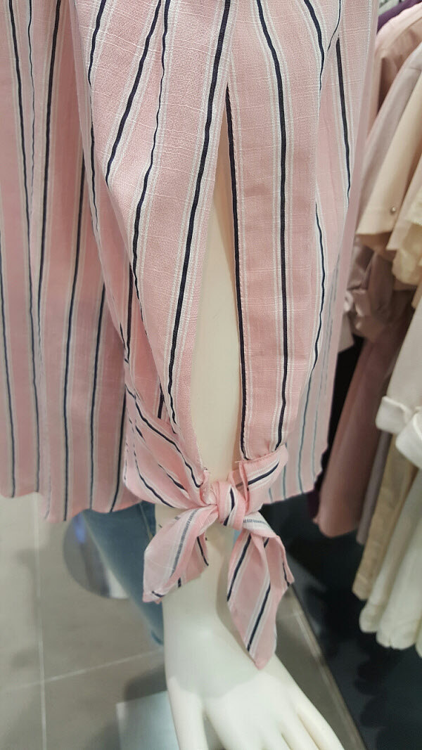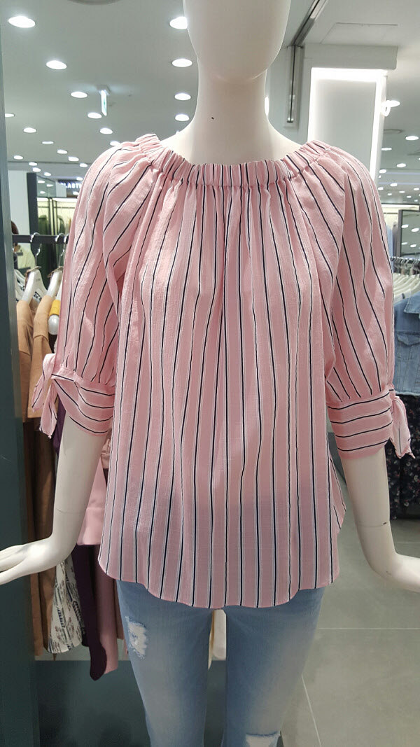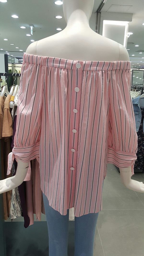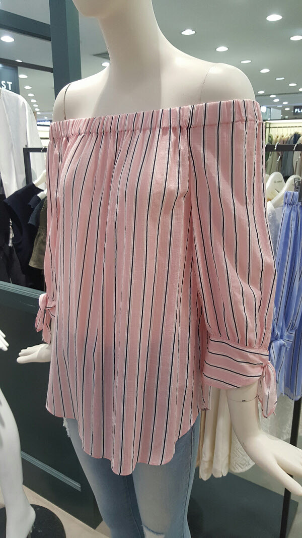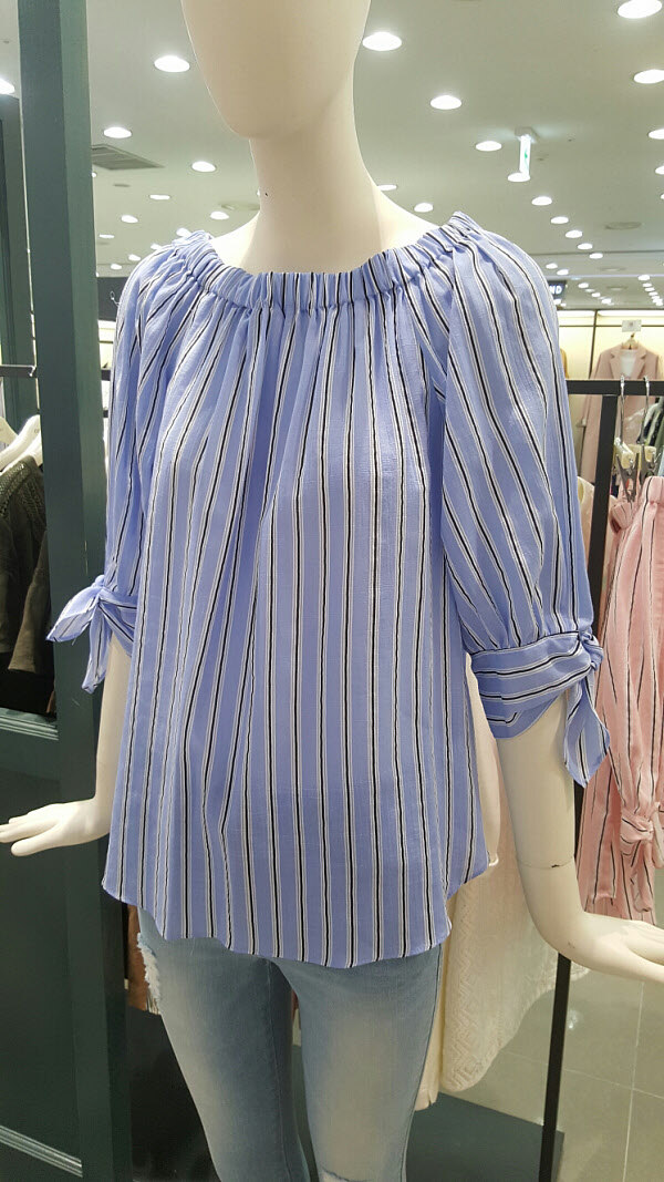 여성스런 오프숄더 블라우스예요~필요에따라 스타일을 변형시킬수있고 소매리본 포인트가 더욱더 여성미를 강조시키는 스타일이예요~