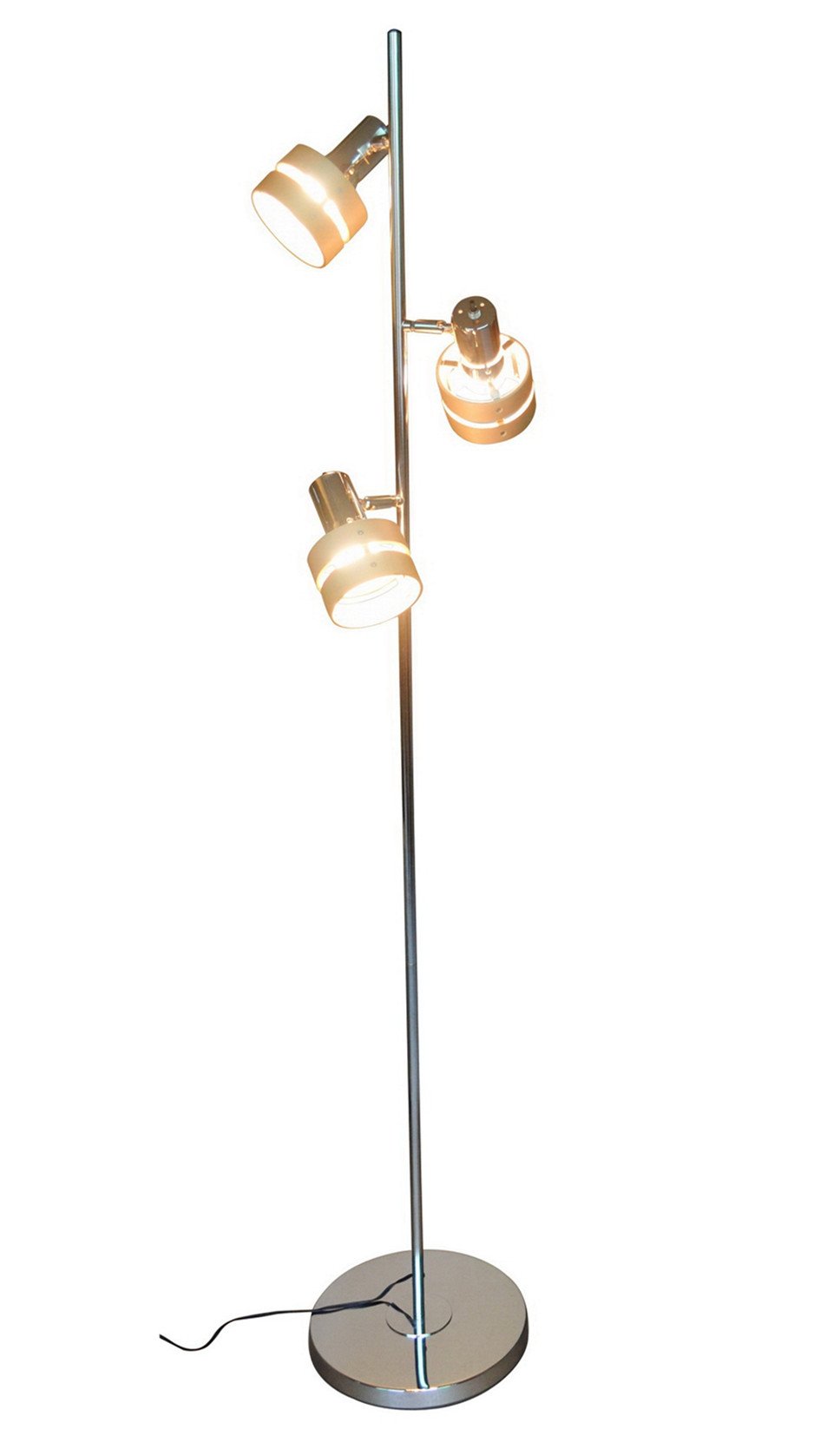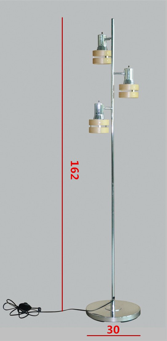 It is a three-lamp floor stand light of fine steel and wood grain shade.