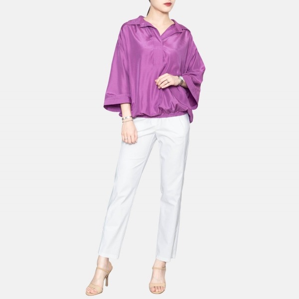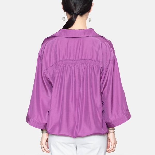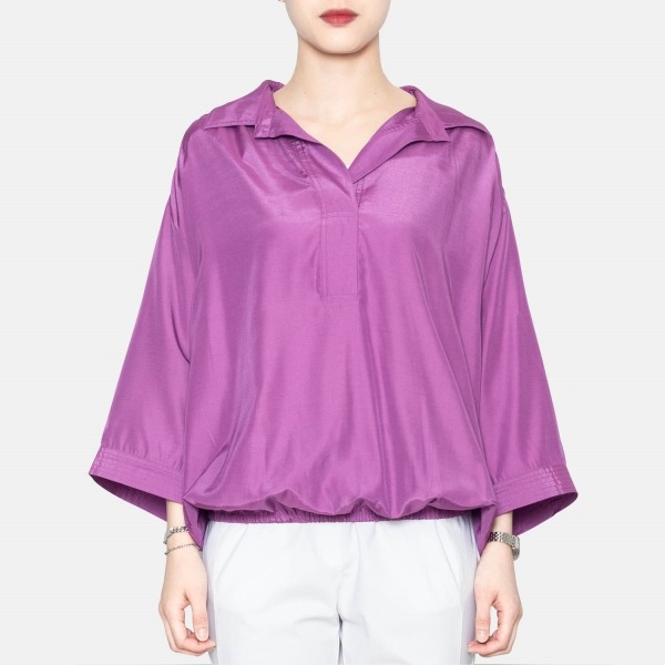 잔잔한 광택감이 있는 소재감의 블라우스 입니다. 루즈한 실루엣과 셔링 디테일이 포인트가 됩니다.