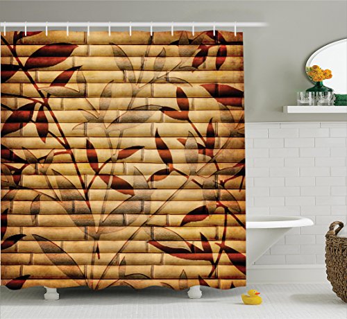 Beige Decor Shower Curtain Set By Ambesonne, Decorative Bamboo Stems And Leaf Figures Over It Spiritual Asian Elements Boho Print, Bathroom Accessories, 69W X 70L Inches, Brown Tan Beige