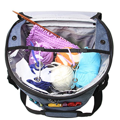 - UNIQUE DESIGN: The clear top for easy view of inside items, 2 small and 2 large grommets for different thickness of yarns to feed through. 2 sets of velcro strips keep yarn in place when not knitting. Additional compartments designed to hold crochet hooks, knitting needles and other knitting supplies.
