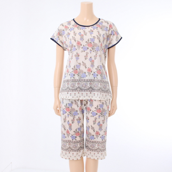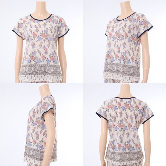 밝고 화사한 컬러감의 꽃 보더나염 스타일로 여성스럽고 우아한 감각의 홈웨어입니다.