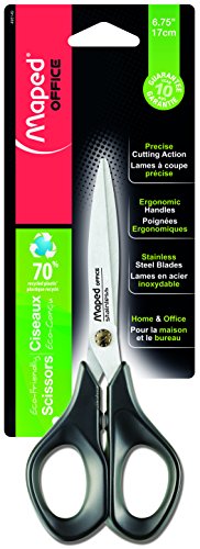 Studio : Maped Helix USA Publisher : Maped Helix USA Binding : Office Product Product Description Maximize your cutting performance while minimizing your impact on the earth with the Advanced Eco-Friendly Scissors! Ergonomic handles are designed to be comfortably used right or left-handed and are made of 70% recycled plastic material, making them the perfect way to show you are eco-friendly. The super-compact, 6.75 inch blades are ideal for precise jobs and the razor-sharp edge makes quick work of all paper, cardboard, cardstock, fabric and more! Backed by a 10 year guarantee, the durable Stainless Steel construction will not rust or tarnish with age so you will always have a smooth and accurate scissor to get the job done. 0
