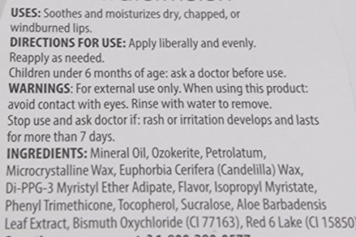 Apply liberally and evenly and reapply as needed. Children under 6 months of age: ask doctor before use. For external use only. When using this product, avoid contact with eyes. Rinse with water to remove. Stop use and ask doctor if: rash or irritation develops and lasts for more than 7 days. Ingredients: Mineral Oil, Ozokerite, Petrolatum, Microcrystalline Wax, Euphorbia Cerifera (Candelilla) Wax, DI-PPG-3 Myristyl Ether Adipate, Flavor, Isopropyl Myristate, Phenyl Trimethicone, Tocopherol, Sucralose, Aloe Barbadensis Leaf Extract, Bismuth Oxychloride, Colors. Distributed by OraLabs, Inc.Feature