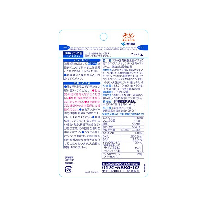 원본상품명: 小林製?の?養補助食品 DHA イチョウ葉 アスタキサンチン 約30日分 90粒