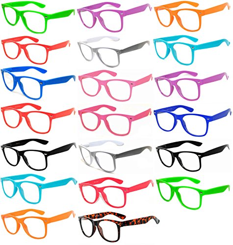 Studio : Green Team Warehouse Publisher : Green Team Warehouse Product Description Glasses style with clear lens. These party glasses are available in different colors, Red, Black, White, Purple, Blue, Neon Green, Yellow, Orange , Pink, Leopard, Turquoise, Box of 20 glasses of the assorted colors. Lens in Poly, frame AC. 0