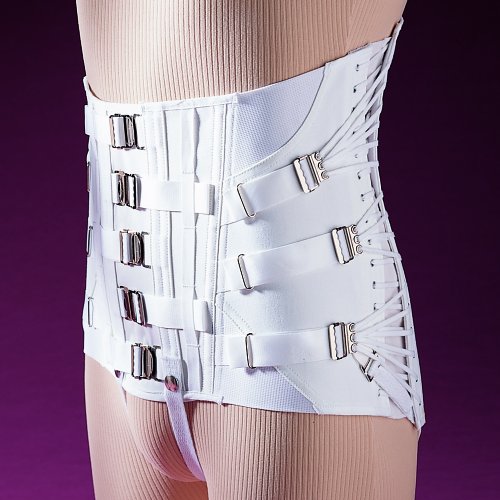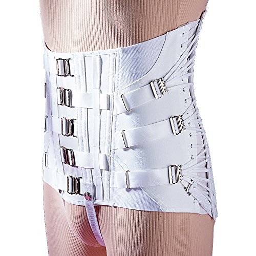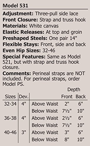 -. Feature : Men's Lumbosacral Support / Three-pull side lace -- Strap & truss-hook closure / Development: 3"-4" / Front Height: 9-1/2"-11" -- Back Height: 16" / Sizes: 32, 34, 36, 38, 40, 42, 44, 46