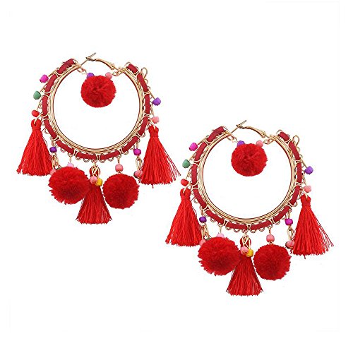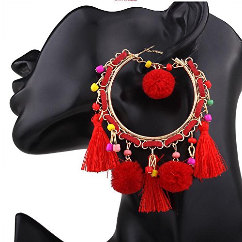Missgrace Women Party Evening Exaggeration Bohemian Rhinestone Vintage Long Tassel Fringe Boho Dangle Ear Earrings (Red)