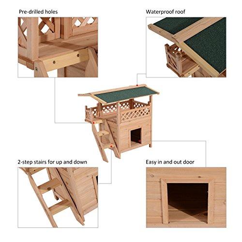 -. Title : Pawhut 2-Story Indoor/Outdoor Wood Cat House Shelter with Roof