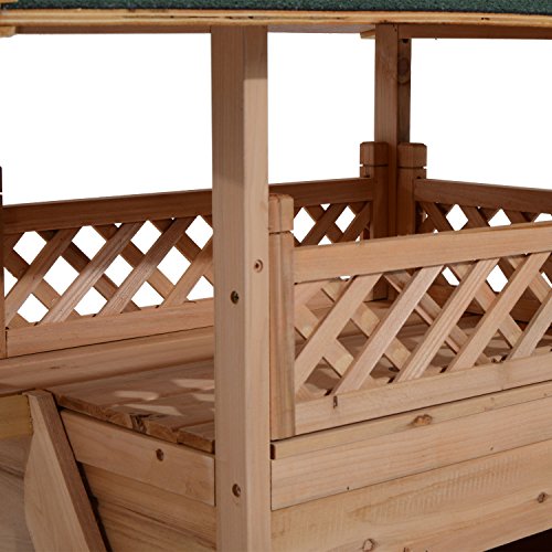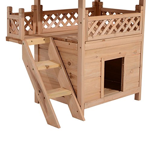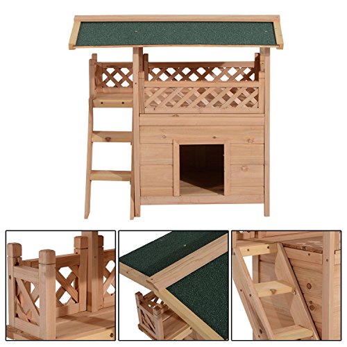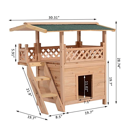 -. Feature : 2-story wooden cat house with roof and weatherproof finish / Includes indoor lounge, climbable stairs and a rooftop balcony with railing / Makes a perfect outdoor shelter for cats and small dogs / Simple assembly with instructions and all hardware included / Overall Dimensions: 30.5"L x 20.5"W x 28.5"H; Indoor Lounge Dimensions: 18"L x 13.25"W x 12.5"H