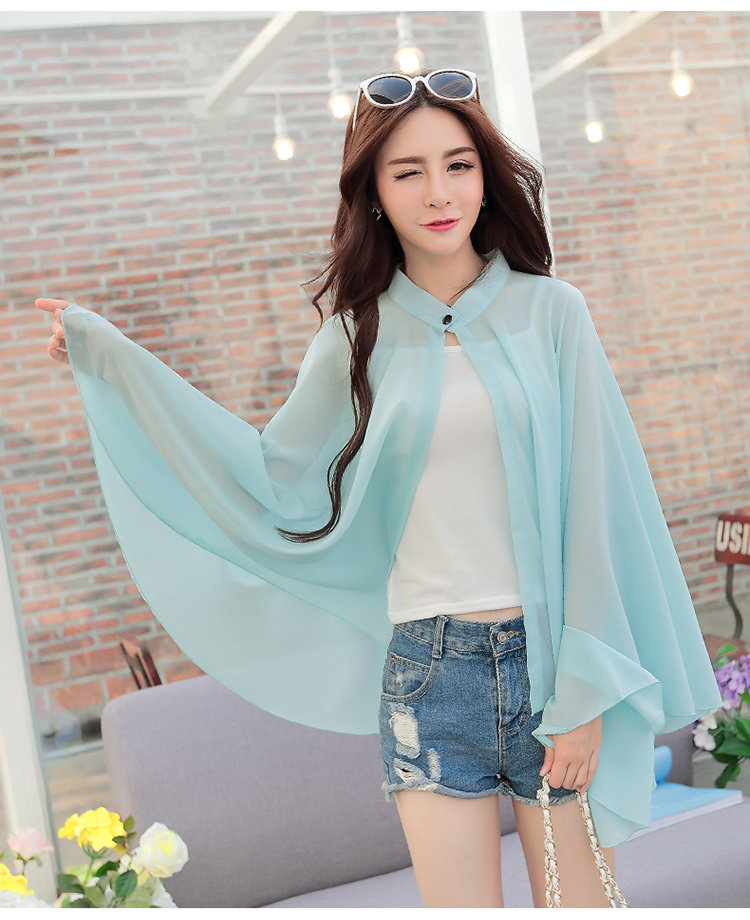 Material: Chiffon Shape: Other Season: Summer Gender: Female Color classification: white black pink blue green light blue light color yellow Item No: QA5654 style: shawl function: shade Applicable: Students aged middle-aged teenager youth Style: Korean clothing style details: flouncing pattern: solid component content: 96%
