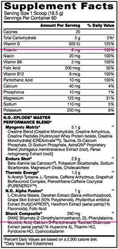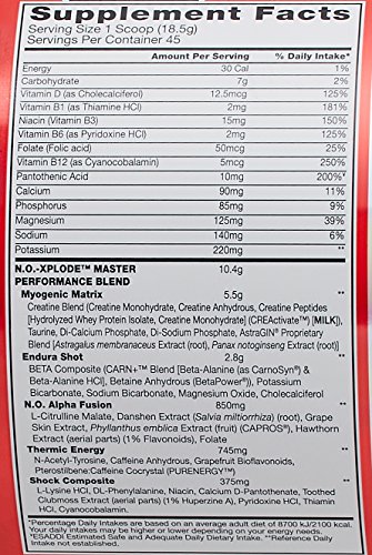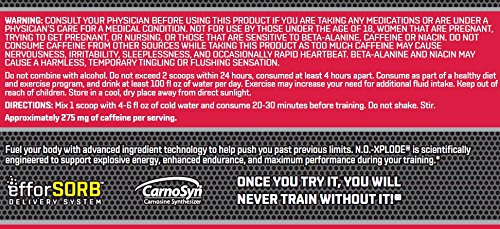 275mg of caffeine, 1.8g of Beta-Alanine, and extreme focus. Get ready to slam plates longer and workout harder. BSN has re-ignited N.O.-XPLODE, the first complete pre-workout that launched in 2004 and has been helping athletes break through barriers ever since. Now with more energy, more feel, more focus, and amazing taste. The weights won't know what hit them.Feature