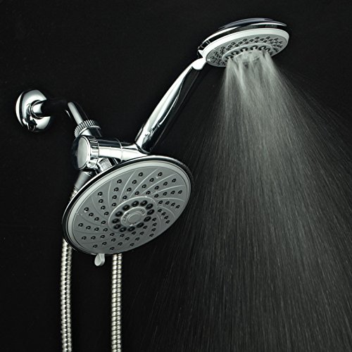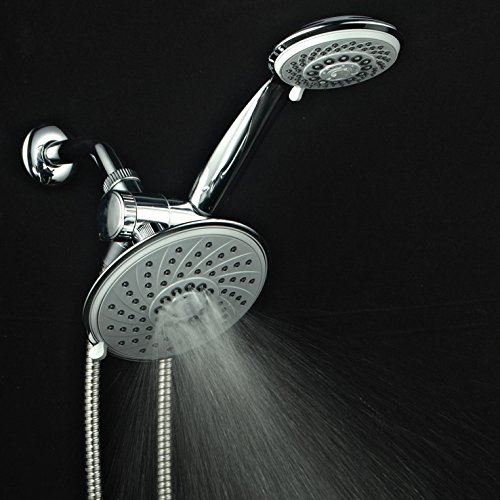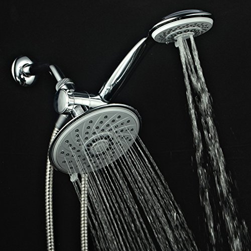 Dual Shower Head System Includes a 6-setting 6 inch Rain Shower Head, 6-setting 4 inch Handheld Shower, Patented 3-way Water Diverter with Anti-swivel Lock Nut, Angle-adjustable Overhead Bracket, 5 Foot Stainless Steel Shower Hose and Plumber's Tape