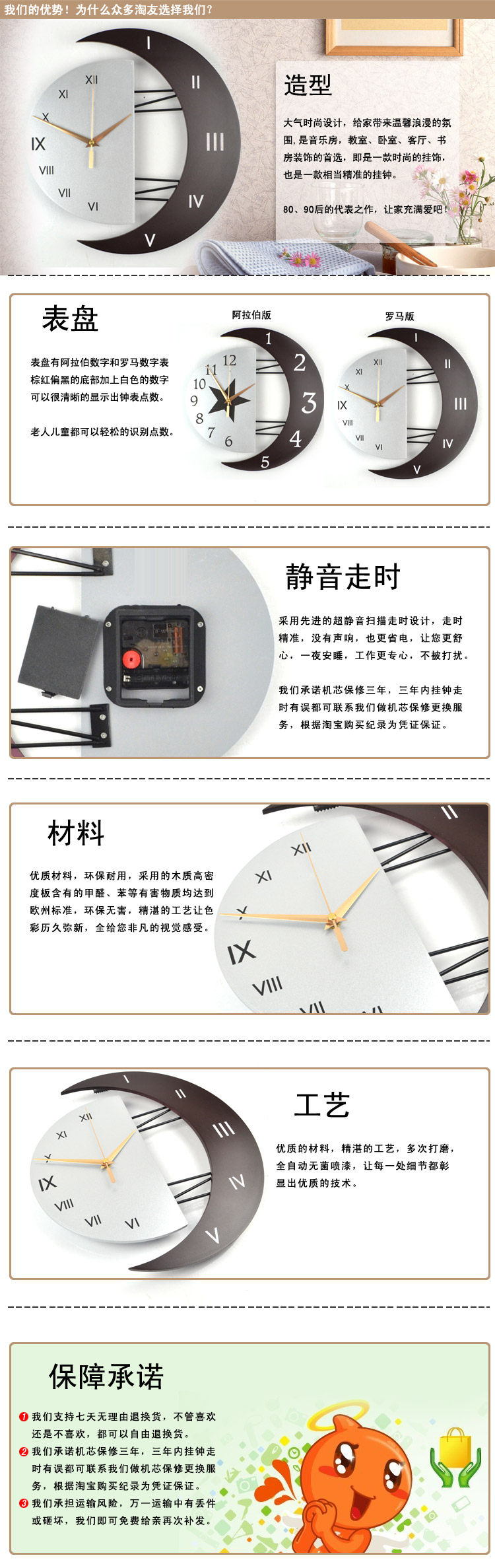 1,wallclock with 10 years free warranty, normal use can be up to 8 years,quality is guaranteed, and is wall clock mute scanning, does notaffect work rest, please pro rest assured tobuy.