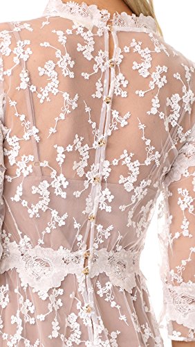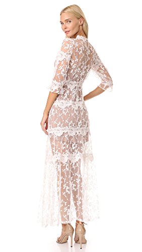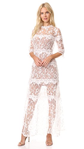 For Love & Lemons Fall 17 collection. Stunning embroidered mesh maxi dress with fold and ovory floral trims, fold flower buttons down back. Elbow sleeve, full sweep.