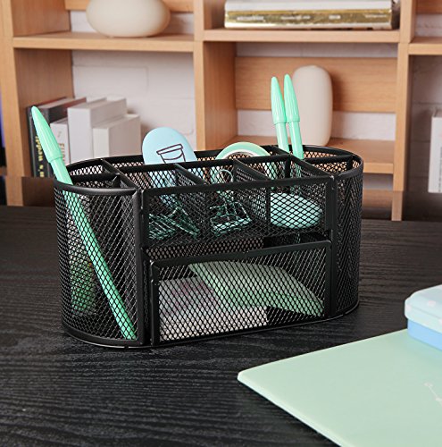 Desk Organizer, Vogek Compact Oval Caddy Desk Organizer with 8 Compartments plus 1 Drawer For Office Supplies & Mesh Collection - Black