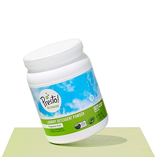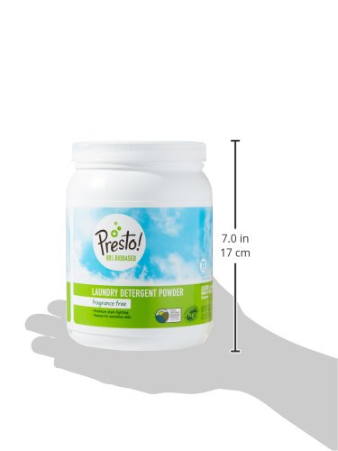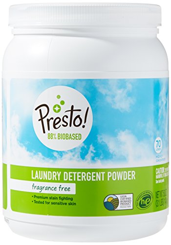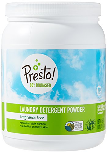 ReleaseDate : 2017-08-30 Studio : Amazon Fulfillment Services, Inc. Publisher : Amazon Fulfillment Services, Inc. Binding : Health and Beauty Product Description Presto! Biobased Laundry Detergent Powder uses a plant-based formula that's tough on dirt yet gentle on skin. Delivering premium cleaning power that effectively removes stubborn stains, our detergent is free of dyes, fragrances, and artificial brighteners. Presto! Laundry Detergent Powder is made with an 88% biobased formula and packaged in a 100% recycled plastic bottle, excluding colorant, providing an alternate, effective choice to petroleum-derived detergents. 0