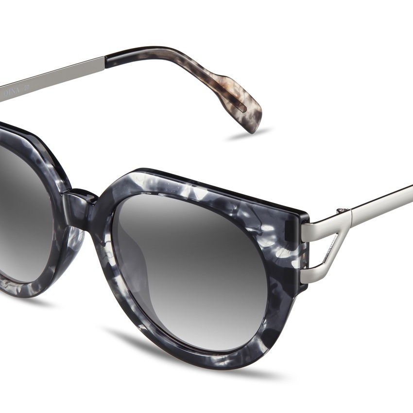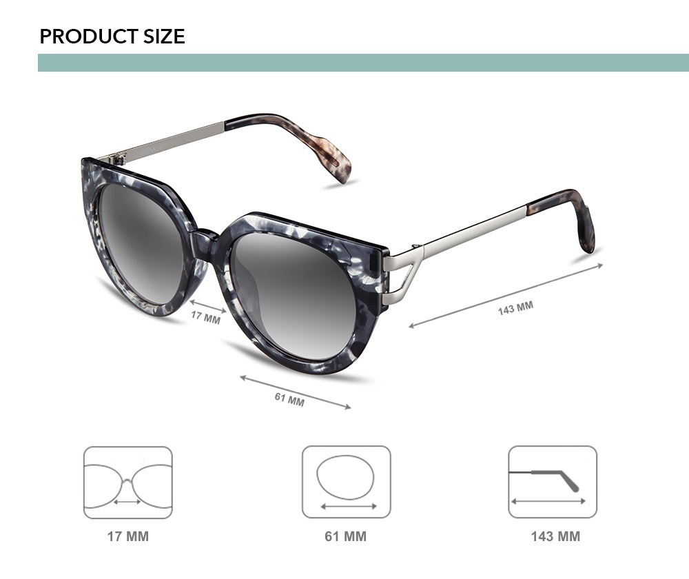 Desain super modern dibuat oleh tim desain international QINA. Bentuk kacamata CATEYE baru ini memiliki frame MULTICOLOR dengan bentuk samping yang bersegi tiga dari metal dan lensa ABU ABU POLARIZED yang menawarkan sentuhan akhir yang luar biasa dan lapisan anti reflektif dan proteksi UV 400 untuk melindungi mata dari efek sinar matahari yang berbahaya. Dikirim dengan kantong designer premium yang unik dan colorful, serta kain pembersih GRATIS