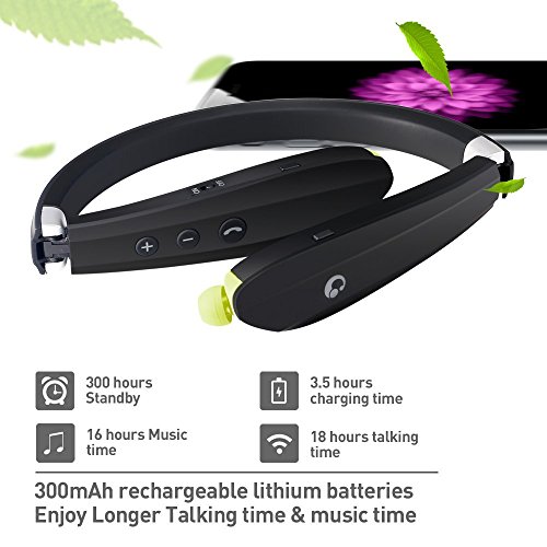 LBell Upgrade Bluetooth Headset, Foldable Bluetooth Headphones with Retractable Earbuds Wireless Bluetooth Earpieces with Mic for iPhone 7 SE 6 6 plus 5 5S and Android Smart Phones (Black + Green)
