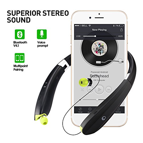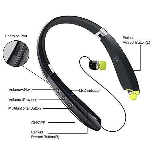 Newest Foldable&Retractable Bluetooth Headphones: With the Humanized Design, this bluetooth earpiece is easy for storage even in your bag and convenient to use; classical neckband design makes comfortable and secure wearing, especially when doing exercise.