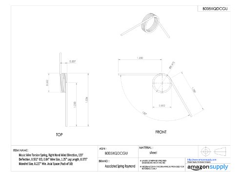 Music Wire Torsion Spring, Right Hand Wind Direction, 120° Deflection, 0.552" OD, 0.04" Wire Size, 1.25" Leg Length, 0.375" Mandrel Size, 0.227" Min. Axial Space (Pack of 10)
