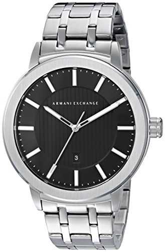 New for fall 2017, this modern Armani Exchange watch features a black textured sunray dial with a striped inner dial paired with a silver-tone case and a brushed-and-polished stainless-steel single-link bracelet.