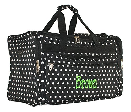 -. Brand : LD BAGS -. Color : Black -. Department : womens -. Feature : Personalize with Name or Initials / 2 End Zipping Compartments / 2 Front Zipping Compartments / Shoulder Strap and Carry Handles with Snaps / Size: 22" x 13" x 11" -. Model : DPLKBLK22YH -. PackageQuantity : 1 -. ProductGroup : Apparel -. ProductTypeName : LUGGAGE -. Size : Large -. Title : Personalized Black and White Polka Dot Duffle Bag 22 Inch