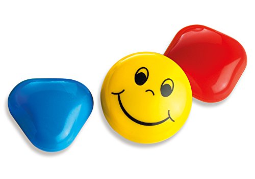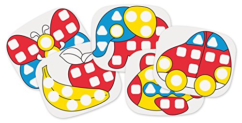 Baby inserts large pegs in primary colors, in a see-through grid, to cover the matching shapes on the simple and bright model pictures.
