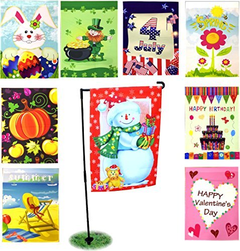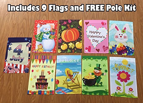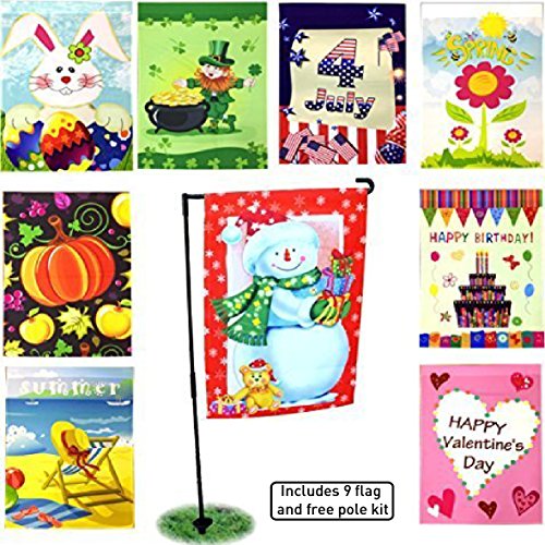 CELEBRATE!! Garden flag pole kit includes 9 two sided printed flags and free bonus flag pole: Birthday –Valentine’s Day – Easter – St. Patrick’s – Summer – 4th of July – Spring – Fall – Winter Holiday and free bonus flag pole stand.